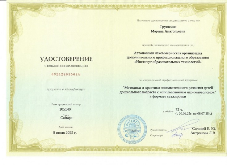 В июне 2025 года я прошла обучение по программе повышения квалификации «Развитие интеллектуальных способностей детей старшего дошкольного возраста с использованием технологии смарт-тренинга».